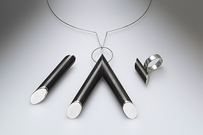 Brož a závěs, 1982, eben, stříbro, nerez ocel, d. 6,8 cm, v. 8,8 cm